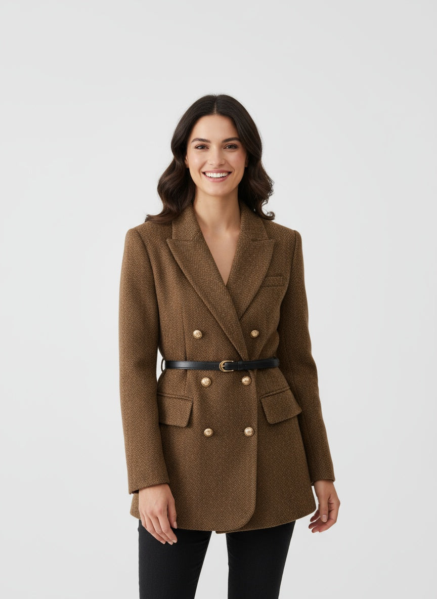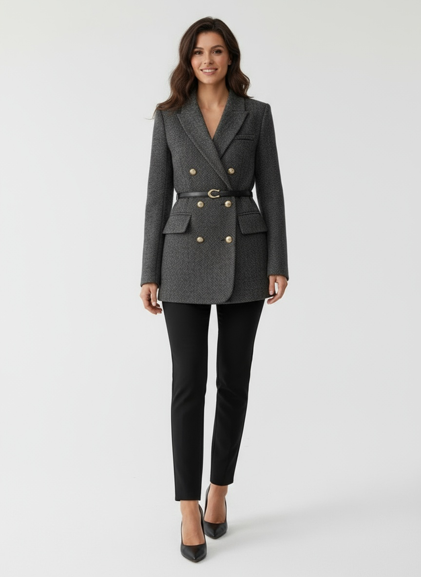 Confeccionada en una mezcla de lana cálida, esta americana ofrece una caída refinada con comodidad suave pero estructurada. El corte entallado se realza con un cinturón en la cintura, solapas anchas y botones dorados cruzados, creando una silueta poderosa y femenina. Perfecta sobre blusas para el trabajo o como prenda exterior en los meses frescos, se adapta fácilmente tanto a entornos profesionales como sociales. Limpieza en seco recomendada para conservar su forma y detalles.