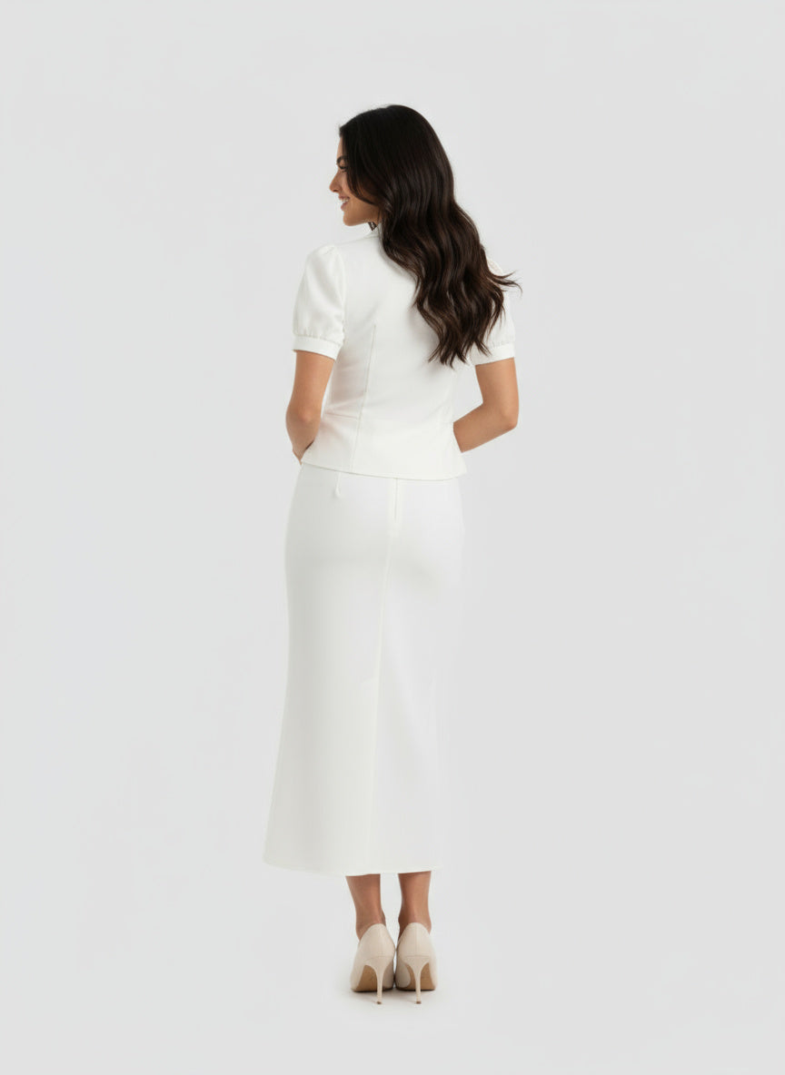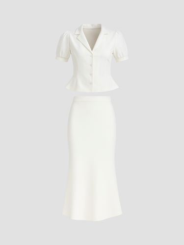 Confeccionado en un tejido liso, este conjunto combina una blusa entallada con mangas abullonadas cortas y cierre de botones con una falda fluida de talle alto. La parte superior aporta estructura, mientras que la falda ofrece movimiento elegante, creando una silueta equilibrada. Perfecto para eventos formales, la oficina o salidas nocturnas, se adapta con naturalidad a todas las estaciones. Lavar en frío o limpieza en seco para conservar su acabado refinado.